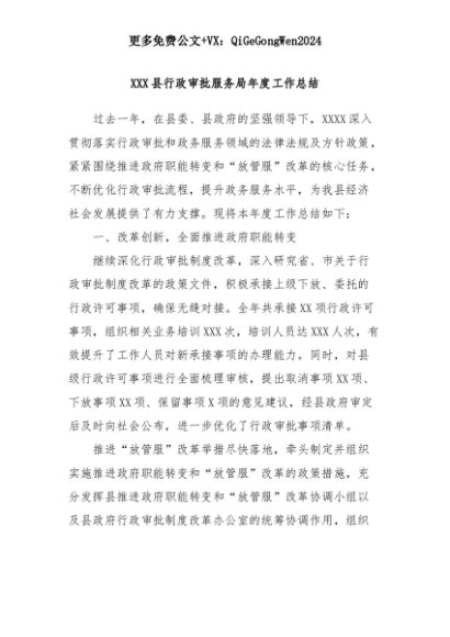 【七哥公文】2025年:XXX县行政审批服务局年度工作总结+更多免费公文+VX:QiGeGongWen2024+更多免费公文+VX:QiGeGongWen2024
