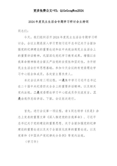 【七哥公文】2025年:2024年度民主生活会专题学习研讨会主持词+更多免费公文+VX:QiGeGongWen2024+更多免费公文+VX:QiGeGongWen2024