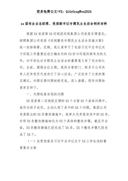 【七哥公文】2025年:xx国有企业总经理、党委副书记专题民主生活会剖析材料+更多免费公文+VX:QiGeGongWen2024+更多免费公文+VX:QiGeGongWen2024
