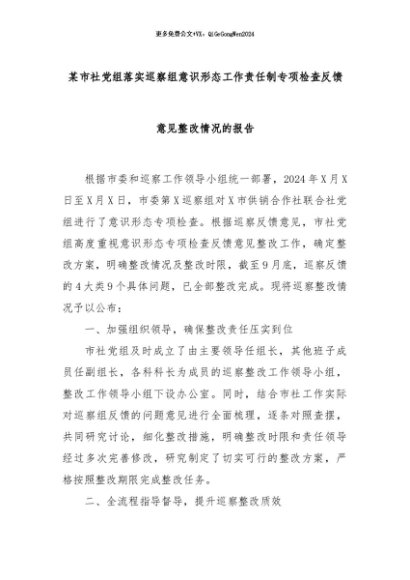 【七哥公文】2024年:某市社党组落实巡察组意识形态工作责任制专项检查反馈意见整改情况的报告+更多免费公文+VX:QiGeGongWen2024