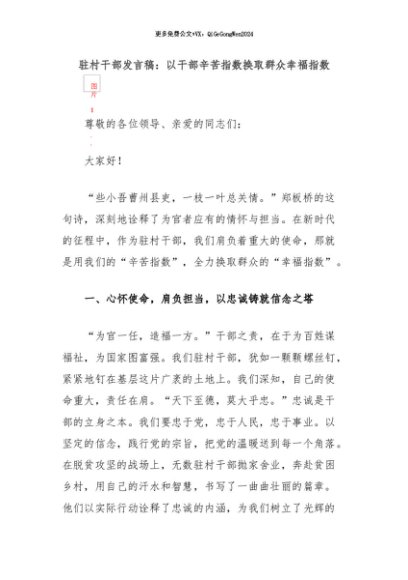 / 【七哥公文】2024年:驻村干部发言稿:以干部辛苦指数换取群众幸福指数+更多免费公文+VX:QiGeGongWen2024