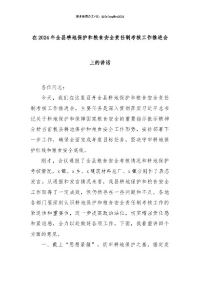 【七哥公文】2024年:在2024年全县耕地保护和粮食安全责任制考核工作推进会上的讲话+更多免费公文+VX:QiGeGongWen2024