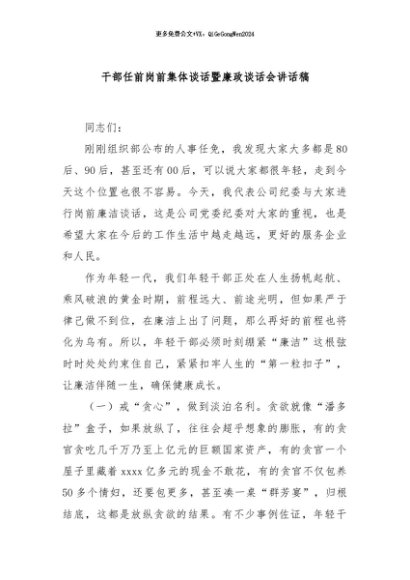 / 【七哥公文】2024年:干部任前岗前集体谈话暨廉政谈话会讲话稿+更多免费公文+VX:QiGeGongWen2024