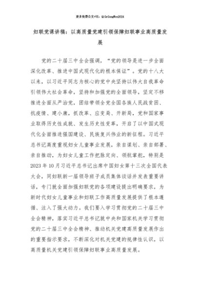【七哥公文】2024年:妇联党课讲稿:以高质量党建引领保障妇联事业高质量发展+更多免费公文+VX:QiGeGongWen2024