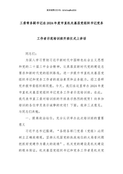 【七哥公文】2024年:工委常务副书记在2024年度市直机关基层党组织书记党务工作者示范培训班开班仪式上讲话+更多免费公文+VX:QiGeGongWen2024