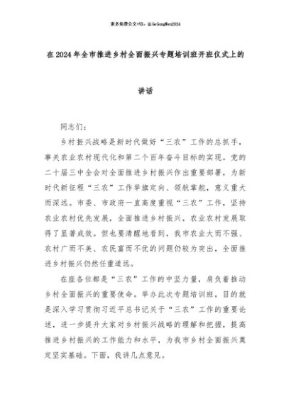【七哥公文】2024年:在2024年全市推进乡村全面振兴专题培训班开班仪式上的讲话+更多免费公文+VX:QiGeGongWen2024