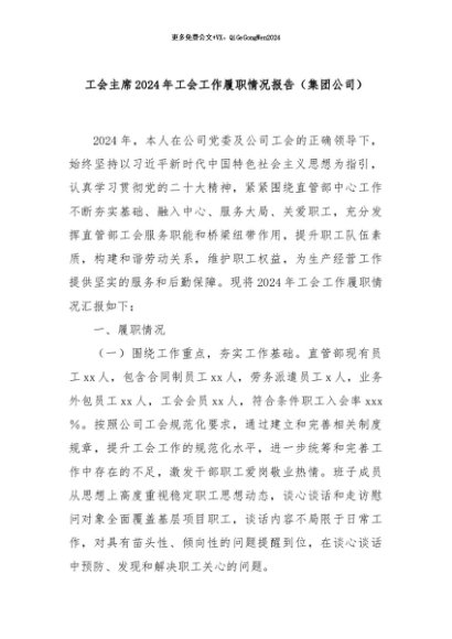 【七哥公文】2024年:工会主席2024年工会工作履职情况报告(集团公司)+更多免费公文+VX:QiGeGongWen2024