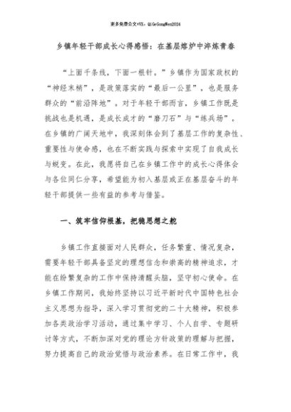 / 【七哥公文】2024年:乡镇年轻干部成长心得感悟:在基层熔炉中淬炼青春+更多免费公文+VX:QiGeGongWen2024