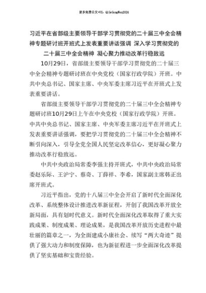 【七哥公文】2024年:11月中心组学习内容:10.29习近平在省部级主要领导干部学习贯彻党的二十届三中全会精神专题研讨班开班式上发表重要讲话强调 深入学习贯彻党的二十届三中全会精神 凝心聚力推动改革行稳致远 (2)+更多免费公文+VX:QiGeGongWen2024