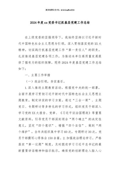 / 【七哥公文】2024年:2024年度xx党委书记抓基层党建工作总结+更多免费公文+VX:QiGeGongWen2024