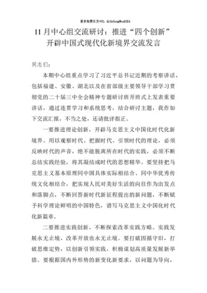 【七哥公文】2024年:11月中心组交流研讨:推进“四个创新” 开辟中国式现代化新境界交流发言+更多免费公文+VX:QiGeGongWen2024