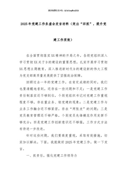 【七哥公文】2024年:2025年党建工作务虚会发言材料(突出“四抓”,提升党建工作质效)+更多免费公文+VX:QiGeGongWen2024