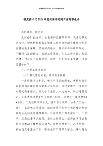 / 【七哥公文】2024年:镇党委书记2024年度抓基层党建工作述职报告+更多免费公文+VX:QiGeGongWen2024