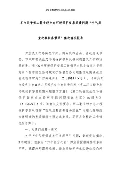 【七哥公文】2024年:某市关于第二轮省级生态环境保护督察反馈问题“空气质量改善任务艰巨”整改情况报告+更多免费公文+VX:QiGeGongWen2024