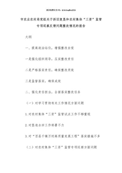 【七哥公文】2024年:市农业农村局党组关于拆旧复垦和农村集体“三资”监管专项巡察反馈问题整改情况的报告+更多免费公文+VX:QiGeGongWen2024
