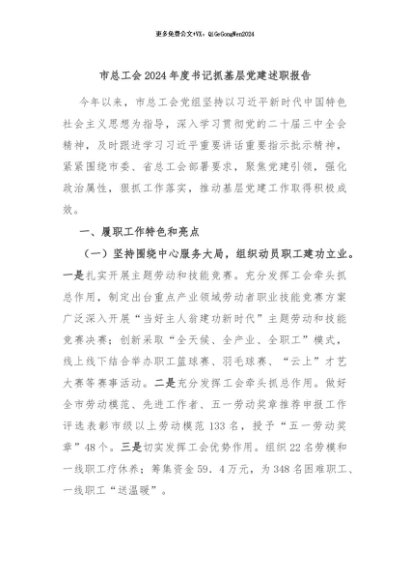 / 【七哥公文】2024年:市总工会2024年度书记抓基层党建述职报告+更多免费公文+VX:QiGeGongWen2024