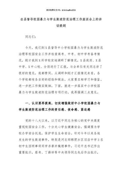 【七哥公文】2024年:在县督导校园暴力与学生欺凌防范治理工作座谈会上的讲话提纲+更多免费公文+VX:QiGeGongWen2024