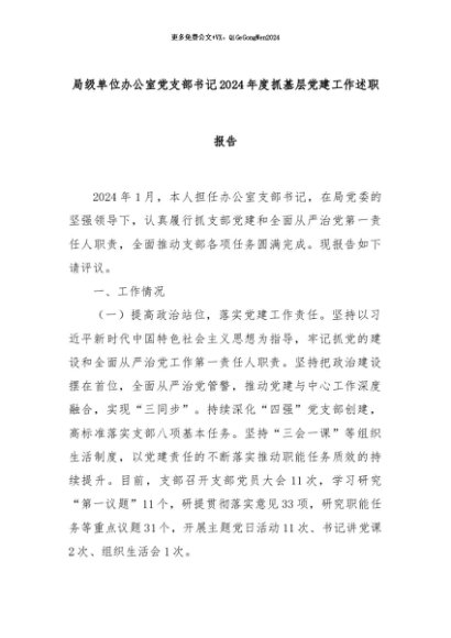 【七哥公文】2024年:局级单位办公室党支部书记2024年度抓基层党建工作述职报告+更多免费公文+VX:QiGeGongWen2024
