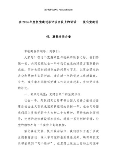 【七哥公文】2024年:在2024年度抓党建述职评议会议上的讲话——强化党建引领,凝聚发展力量+更多免费公文+VX:QiGeGongWen2024