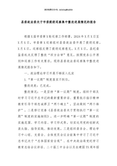 / 【七哥公文】2024年:县委政法委关于市委提级巡察集中整改进展情况的报告+更多免费公文+VX:QiGeGongWen2024