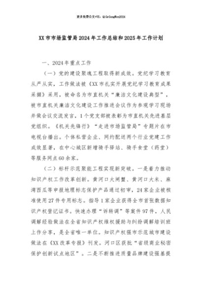 【七哥公文】2024年:XX市市场监管局2024年工作总结和2025年工作计划+更多免费公文+VX:QiGeGongWen2024