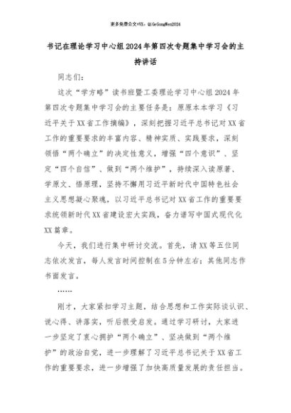 【七哥公文】2024年:书记在理论学习中心组2024年第四次专题集中学习会的主持讲话+更多免费公文+VX:QiGeGongWen2024