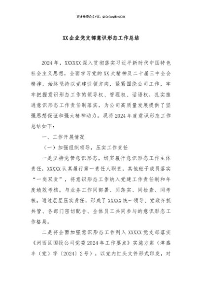 / 【七哥公文】2024年:XX企业党支部意识形态工作总结+更多免费公文+VX:QiGeGongWen2024