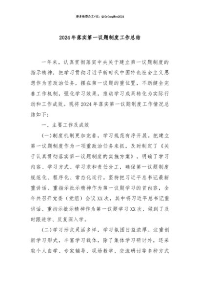 / 【七哥公文】2024年:2024年落实第一议题制度工作总结+更多免费公文+VX:QiGeGongWen2024