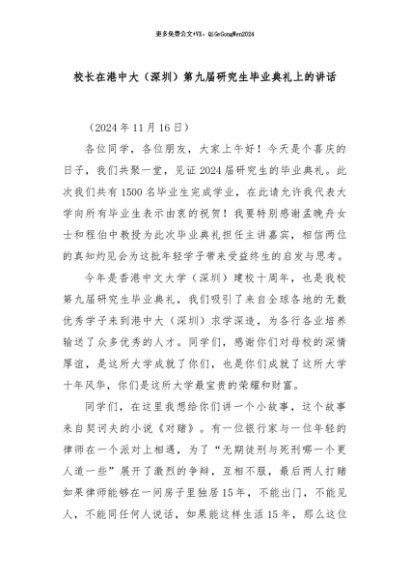 / 【七哥公文】2024年:校长在港中大(深圳)第九届研究生毕业典礼上的讲话+更多免费公文+VX:QiGeGongWen2024