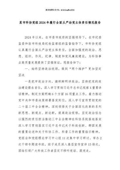 【七哥公文】2024年:某市科协党组2024年履行全面从严治党主体责任情况报告+更多免费公文+VX:QiGeGongWen2024