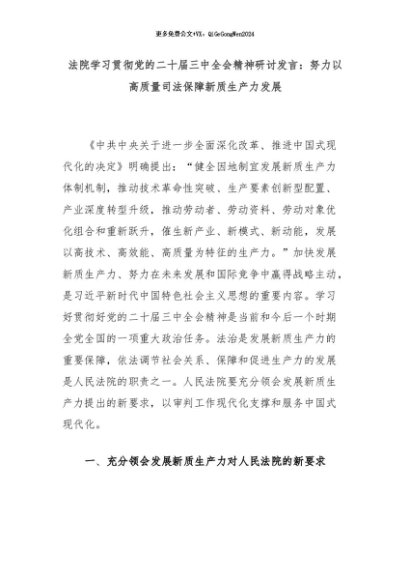 【七哥公文】2024年:法院学习贯彻党的二十届三中全会精神研讨发言:努力以高质量司法保障新质生产力发展+更多免费公文+VX:QiGeGongWen2024