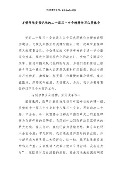 / 【七哥公文】2024年:某银行党委书记党的二十届三中全会精神学习心得体会+更多免费公文+VX:QiGeGongWen2024