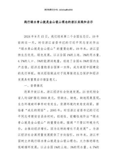/ 【七哥公文】2024年:践行绿水青山就是金山银山理念的浙江实践和启示+更多免费公文+VX:QiGeGongWen2024