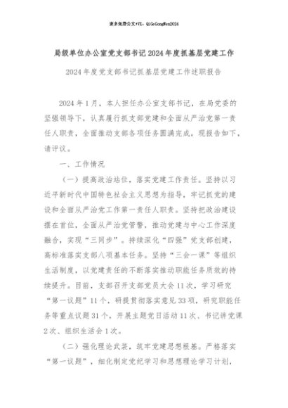 【七哥公文】2024年:局级单位办公室党支部书记2024年度抓基层党建工作+更多免费公文+VX:QiGeGongWen2024