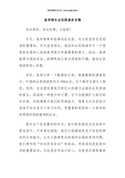 / 【七哥公文】2024年:宣传部长全民阅读发言稿+更多免费公文+VX:QiGeGongWen2024