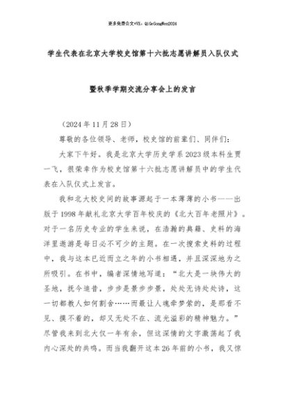 【七哥公文】2024年:学生代表在北京大学校史馆第十六批志愿讲解员入队仪式暨秋季学期交流分享会上的发言+更多免费公文+VX:QiGeGongWen2024