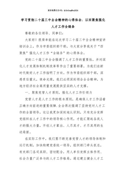 【七哥公文】2024年:学习贯彻二十届三中全会精神的心得体会:以四聚焦强化人才工作全链条+更多免费公文+VX:QiGeGongWen2024