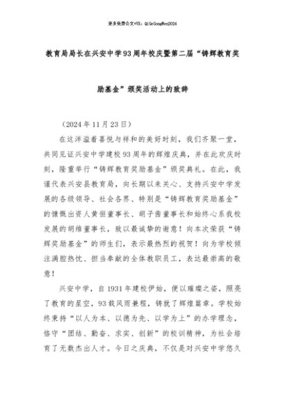 【七哥公文】2024年:教育局局长在兴安中学93周年校庆暨第二届“铸辉教育奖励基金”颁奖活动上的致辞+更多免费公文+VX:QiGeGongWen2024