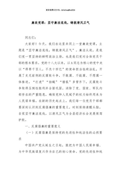 / 【七哥公文】2024年:廉政党课:坚守廉洁底线,铸就清风正气+更多免费公文+VX:QiGeGongWen2024
