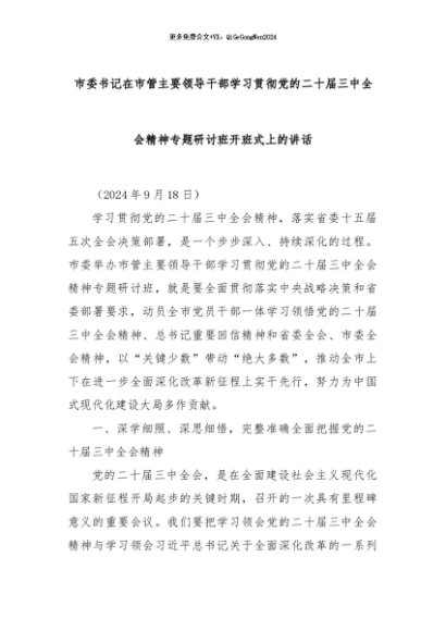 【七哥公文】2024年:市委书记在市管主要领导干部学习贯彻党的二十届三中全会精神专题研讨班开班式上的讲话+更多免费公文+VX:QiGeGongWen2024