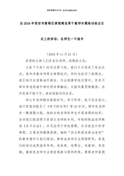 【七哥公文】2024年:在2024年西安市雁塔区课程建设骨干教师专题培训结业仪式上的讲话:名师无一不读书+更多免费公文+VX:QiGeGongWen2024
