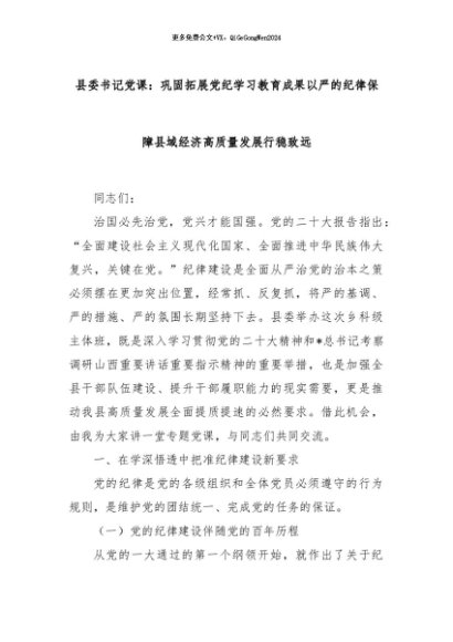 【七哥公文】2024年:县委书记党课:巩固拓展党纪学习教育成果以严的纪律保障县域经济高质量发展行稳致远+更多免费公文+VX:QiGeGongWen2024