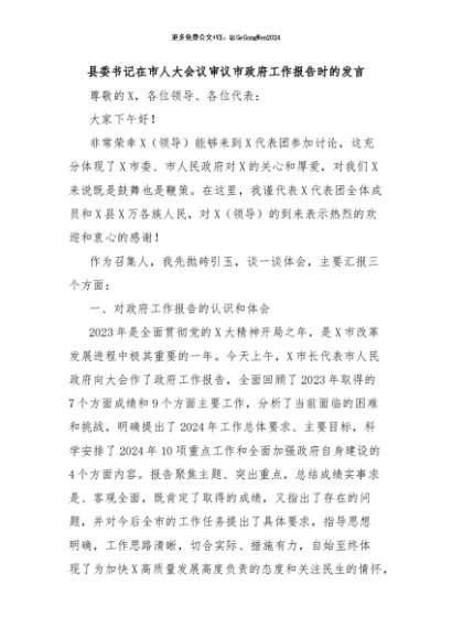 / 【七哥公文】2024年:县委书记在市人大会议审议市政府工作报告时的发言+更多免费公文+VX:QiGeGongWen2024