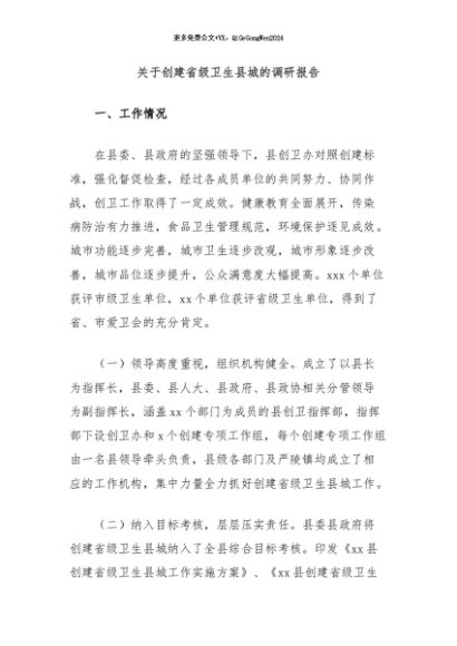/ 【七哥公文】2024年:关于创建省级卫生县城的调研报告+更多免费公文+VX:QiGeGongWen2024