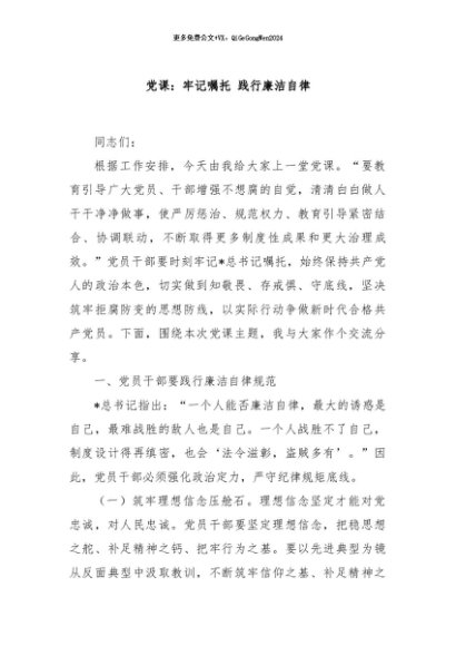 / 【七哥公文】2024年:党课:牢记嘱托 践行廉洁自律+更多免费公文+VX:QiGeGongWen2024