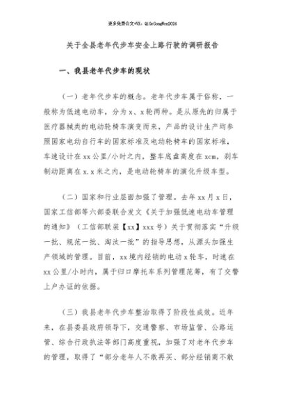 / 【七哥公文】2024年:关于全县老年代步车安全上路行驶的调研报告+更多免费公文+VX:QiGeGongWen2024