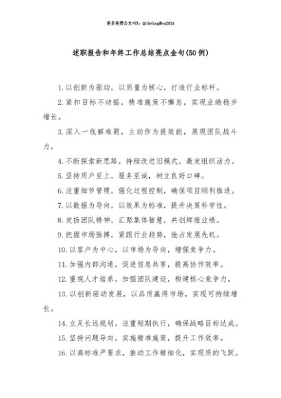 【七哥公文】2024年:(50例)述职报告和年终工作总结亮点金句+更多免费公文+VX:QiGeGongWen2024