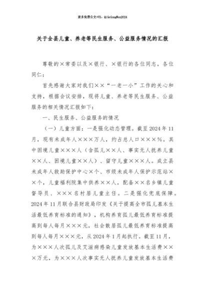 / 【七哥公文】2024年:关于全县儿童、养老等民生服务、公益服务情况的汇报+更多免费公文+VX:QiGeGongWen2024