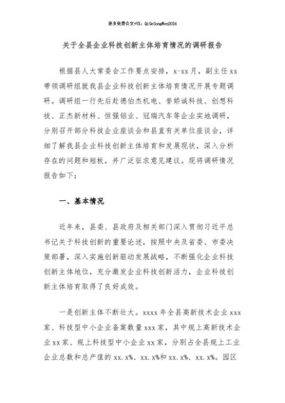 / 【七哥公文】2024年:关于全县企业科技创新主体培育情况的调研报告+更多免费公文+VX:QiGeGongWen2024