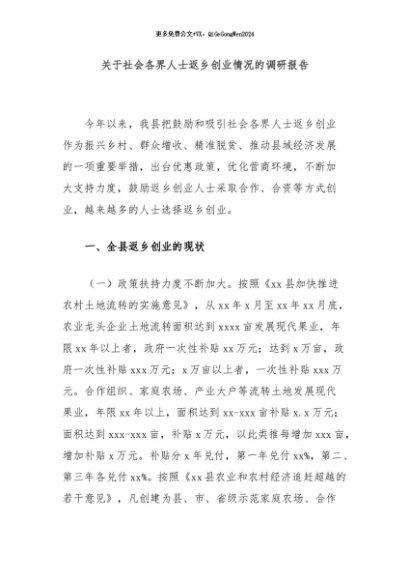 / 【七哥公文】2024年:关于社会各界人士返乡创业情况的调研报告+更多免费公文+VX:QiGeGongWen2024